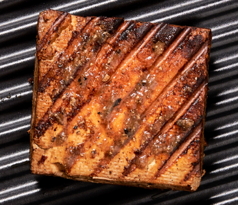Heize Deinen Grill im Freien, Zimmergrill oder Kontaktgrill vor. Lege den Kichererbsentofu auf den Grill und grille ihn circa 5 Minuten, bis er eine herrliche Röstkruste hat. Bestreiche ihn zwischendurch mit der verbliebenen superleckeren omami-Marinade aus der Packung. Dann wird er noch knuspriger.