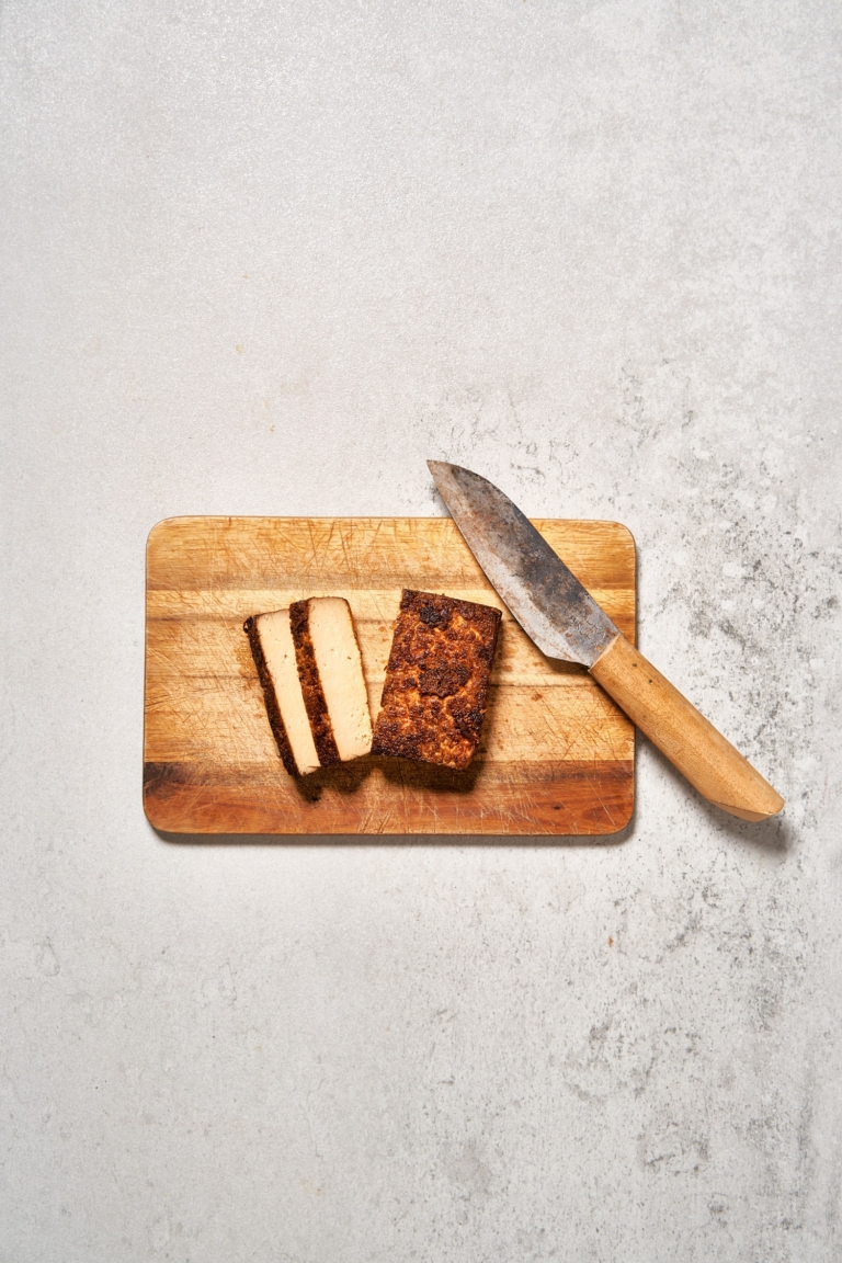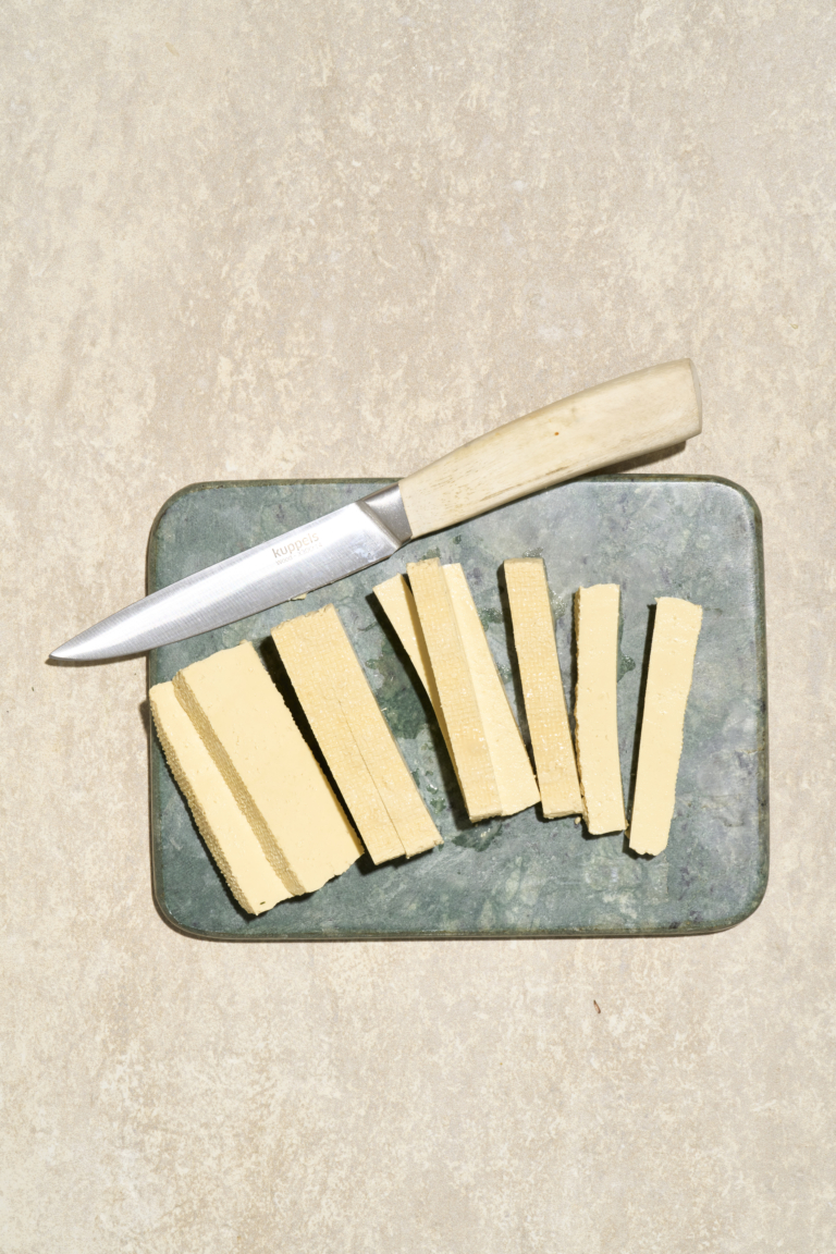 Schneide den omami-Kichererbsentofu in 2 Hälften, die du wiederum halbierst.