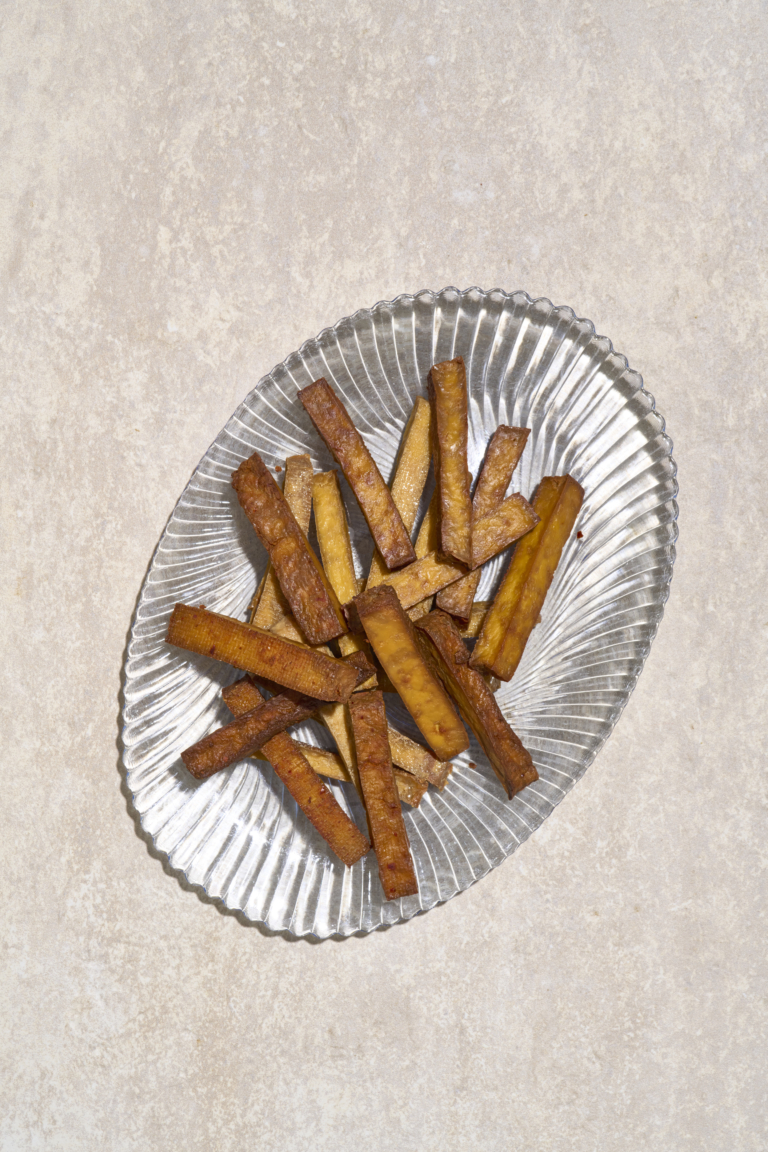 Tofu-Fries im Backofen ca. 10-15 Minuten bei 200°C Umluft backen. Alternativ im Airfryer oder der Fritteuse backen.