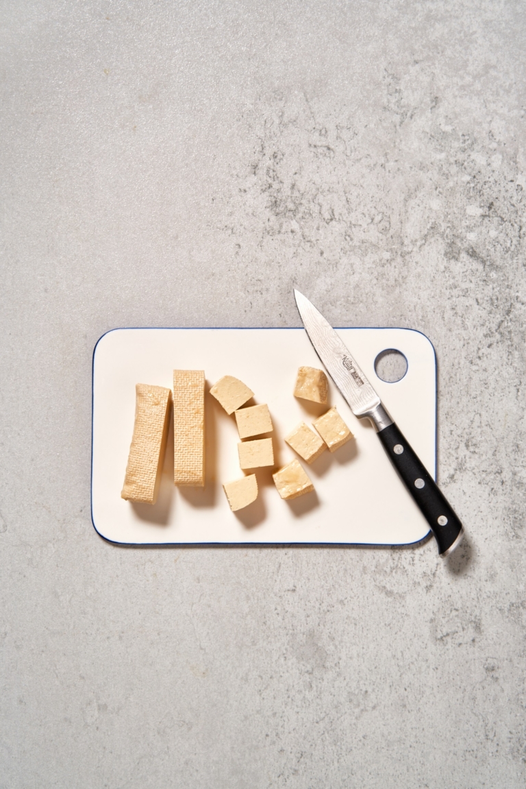 Schneide den omami-Tofu Deiner Wahl in gleichmäßige Würfel.
