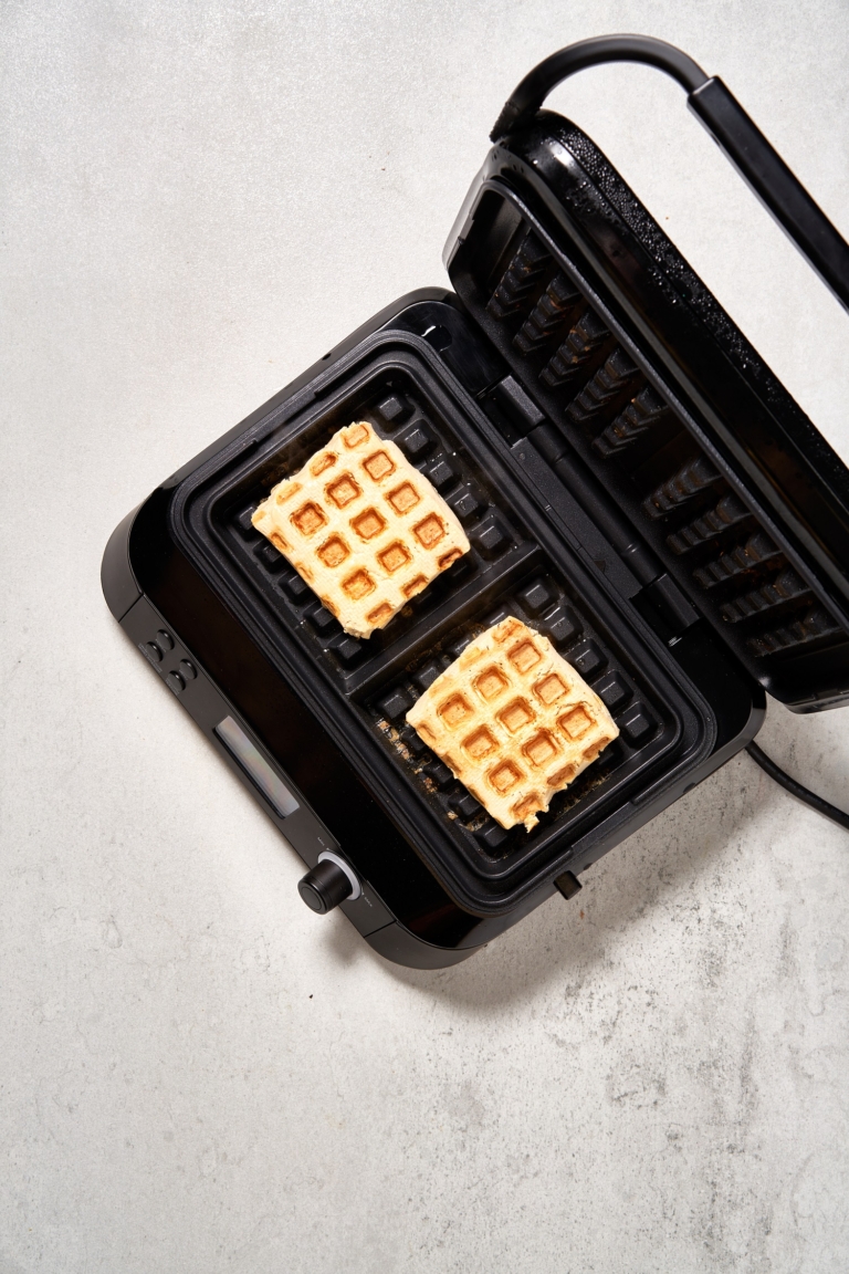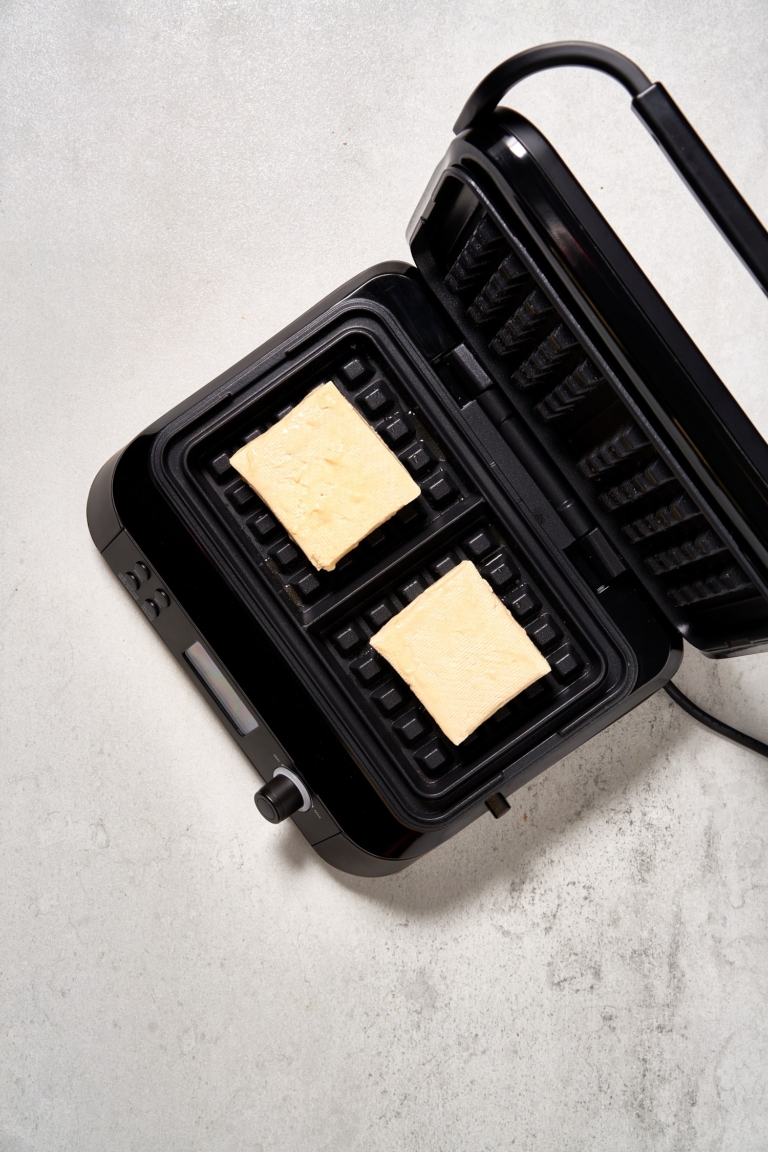 Backe die Tofuhälften 3-5 Minuten, bis sie goldbraun und außen crispy sind. Nimm die gebackenen Tofu-Waffeln vorsichtig mit einem Spatel aus dem Waffeleisen.