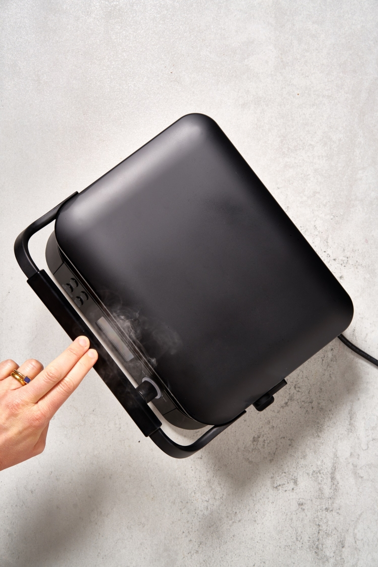 Schließe den Deckel. Drücke während des Garens den Deckel leicht mit der Hand zu, damit sich Mulden bilden.