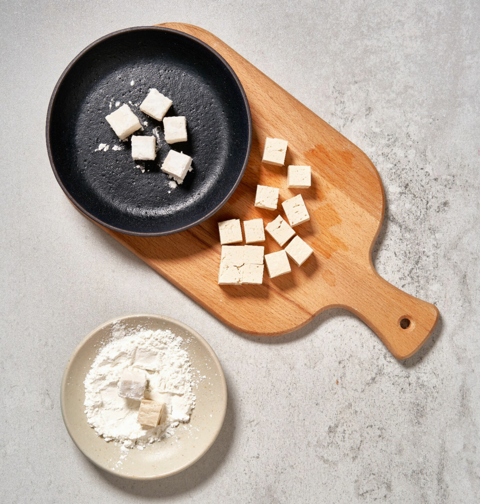 Schneide den omami-Tofu Deiner Wahl in gleichmäßige Würfel.