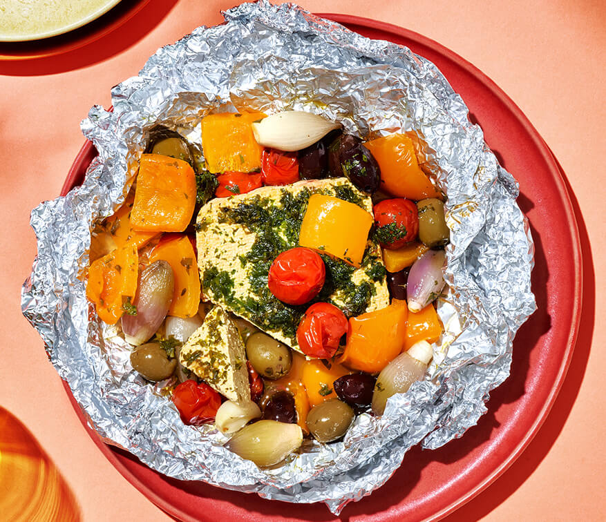 Buntes Tofu-Grillpäckchen mit frischer Kräutermarinade