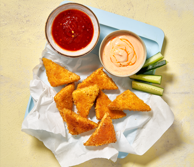 - Den Tofu in Dreiecke schneiden und in der restlichen Maisstärke wälzen.